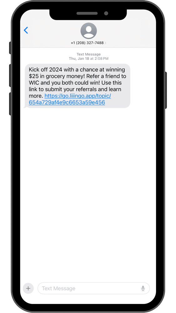 To support the referral campaign, we developed the SMS messaging schedule, crafting the copy and selecting optimal send days and times. The copy highlighted the opportunity for both the participants and their referrers to receive a $25 grocery gift card upon successful application. The messages were sent by our client, Central District Health, to their current WIC contact base—individuals already enrolled in the program—using their system. This approach ensured HIPAA compliance, as all messages were delivered securely and directly through the client’s platform, safeguarding participant privacy. By sending well-timed, relevant messages, we helped ensure the campaign reached the audience effectively while maintaining privacy and compliance.